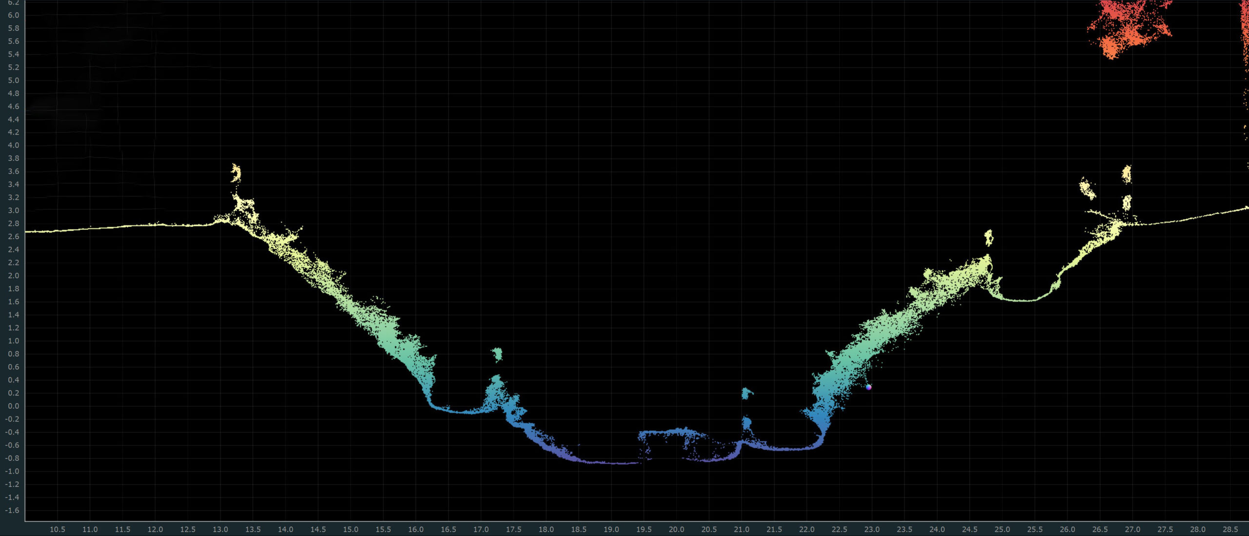 まいまい部分を点群の断面で見ると、地表から3.5~4mくらい掘りこんでいるようです。点群の断面ではちょっとわかりにくいですが、この穴の底に井戸が設置されていました。先ほども書きましたが、標高値は正しくなく相対的なものです。