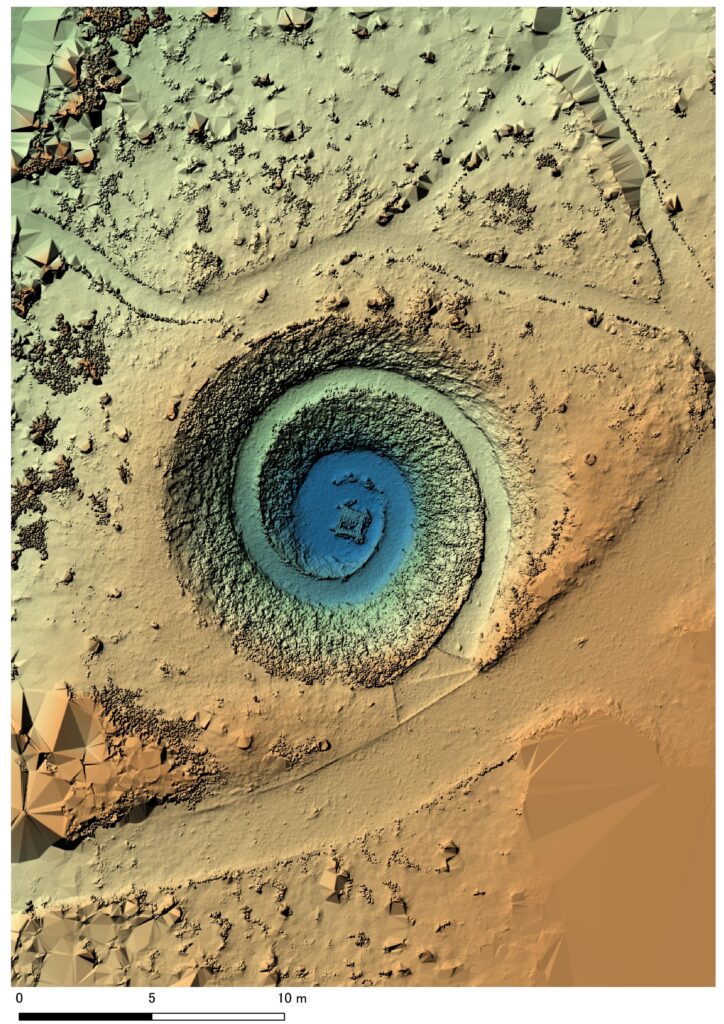 点群表示もよいのですが、平面図にした方が面白そうでしたので、井戸の周りの木々を(てきとうに)除去して平面図も作ってみました。まいまいな感じがいいですね。歩いて井戸の底に下りると結構な距離があります。ここから水を組むのは結構な苦労があったのではないでしょうか。