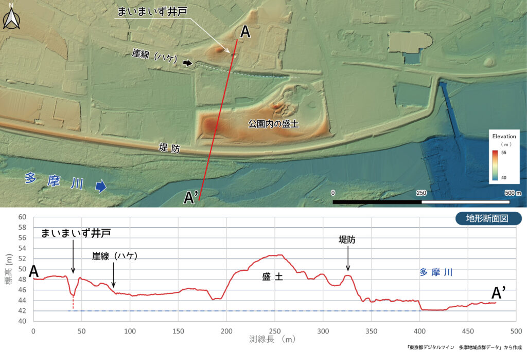 井戸の底には水がありました。前述したとおり、この復元井戸は復元前の場所(府中市寿町)よりも一段低い段丘面(というか沖積面)の上に復元されていますので、地下水位は復元前の場所とは違っていそうです。東京都のオープンデータを使って復元井戸と多摩川を結ぶ断面図を作ってみると、多摩川の水面からすちばち底面までの高さは3mくらいですので、現在の地下水位はそのあたりにあるのかな、と想像しました。