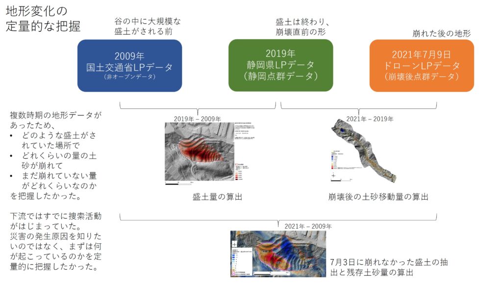その後、個人として情報収集する中で、縁があって「静岡点群サポートチーム」に参加させていただき、災害の状況を把握するための地形解析等を担当しました。静岡県では全国の自治体に先駆けて「VIRTUAL SHIZUOKA」という航空レーザー計測による点群データや空中写真がオープンデータとして整備され、公開されていました。このデータが災害発生直後の状況把握のために役に立ちました。発災直後にはすぐに捜索活動などが始まっていましたので、被災地域の上流で何が起こったのかを把握することは緊急の課題でした。災害が起こる前の状況がアーカイブされているというのは、災害状況を把握するのにたいへん有効です。