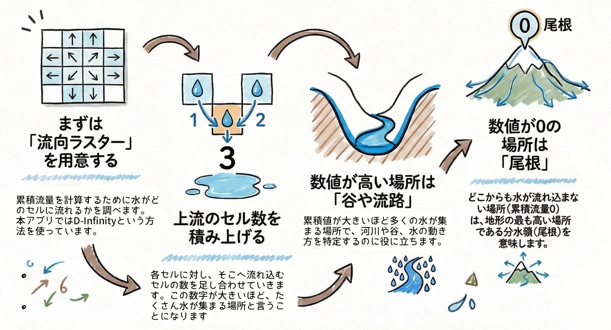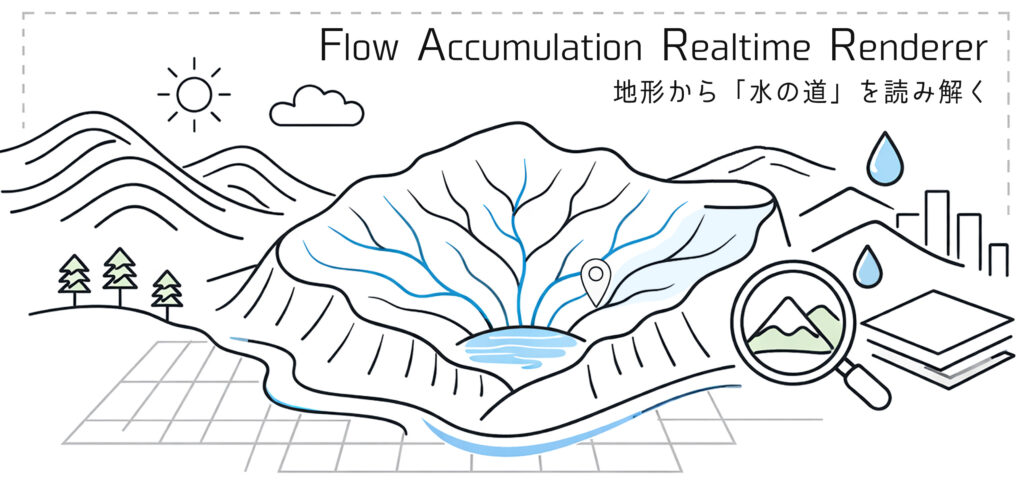 このアプリは、国土地理院や産業技術総合研究所が公開している精密な標高データ(DEM)を使い、その場所の地形に基づいて「どこに、どのように水が集まるポテンシャルがあるか」を可視化するブラウザアプリです。